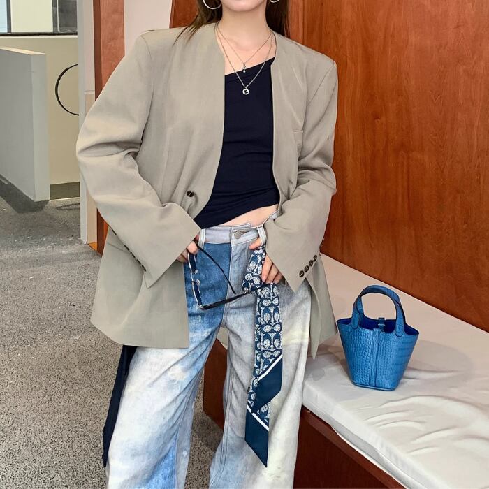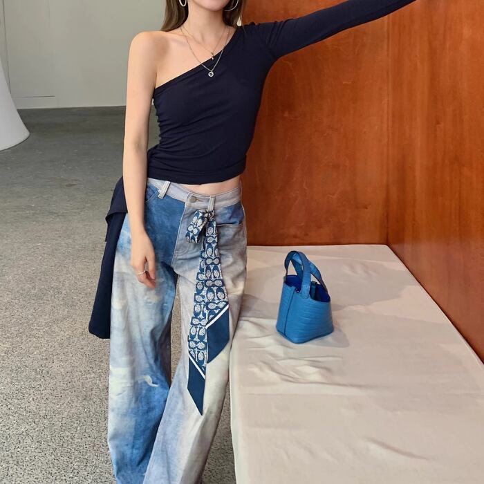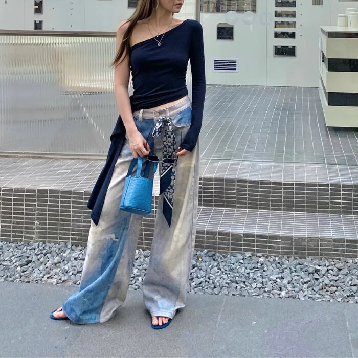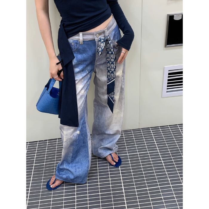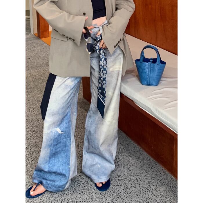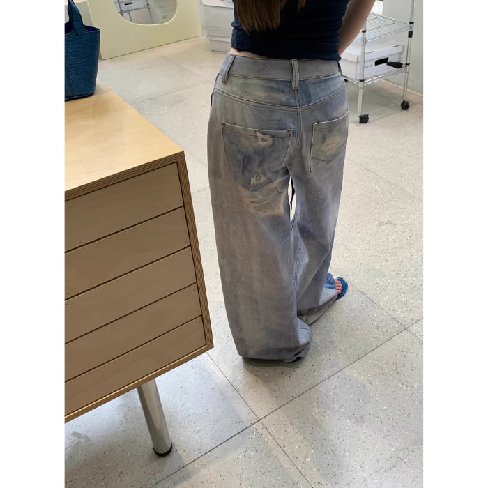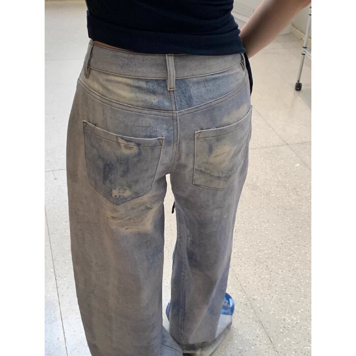 ダメージプリントハイウエストワイドジーンズ【XS-L】